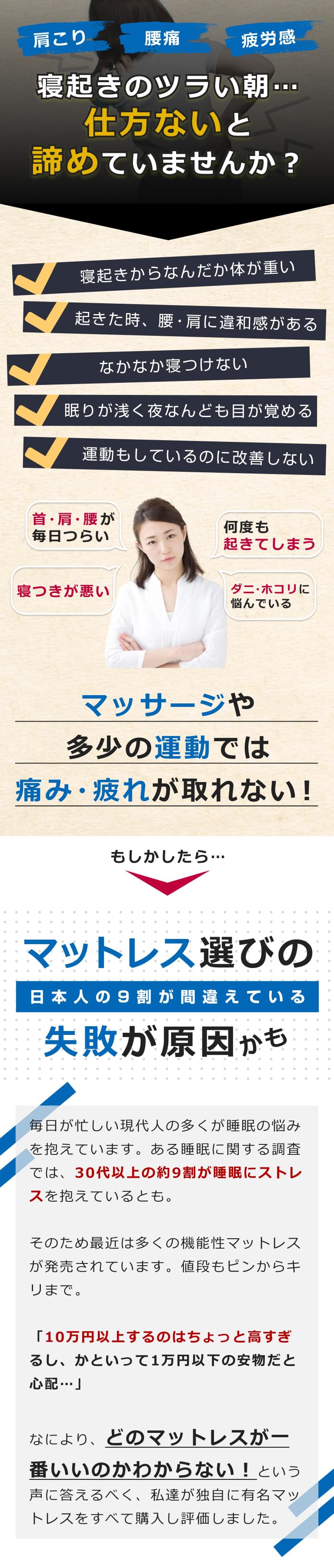 たっぷり眠っても、朝起きると慢性的な腰痛や肩こりに悩まされる場合、適度な硬さのある高反発マットレスをオススメしています。