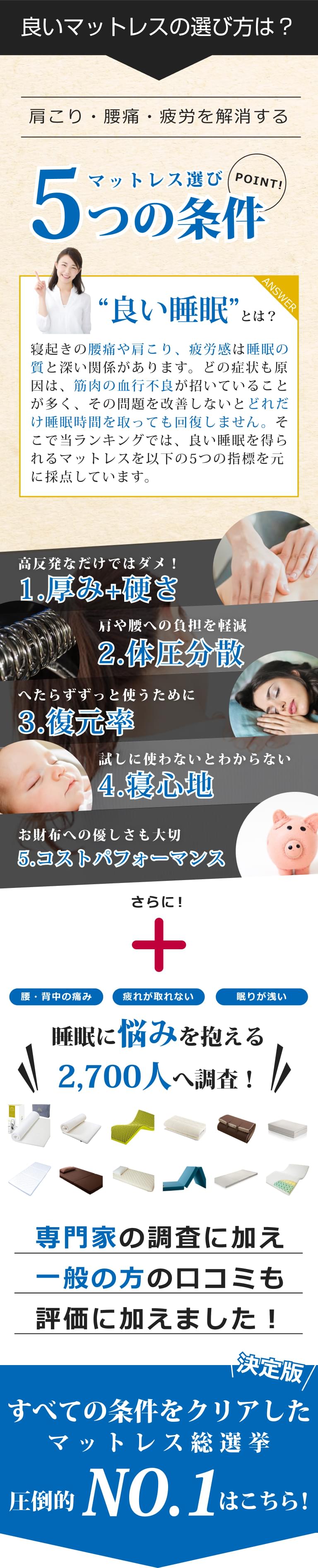 ここまで書いてきた「厚みと硬さ」「耐圧分散」「復元率」などの要素を満たしながらも、ご予算に合うマットレスを選択していただければ幸いです。